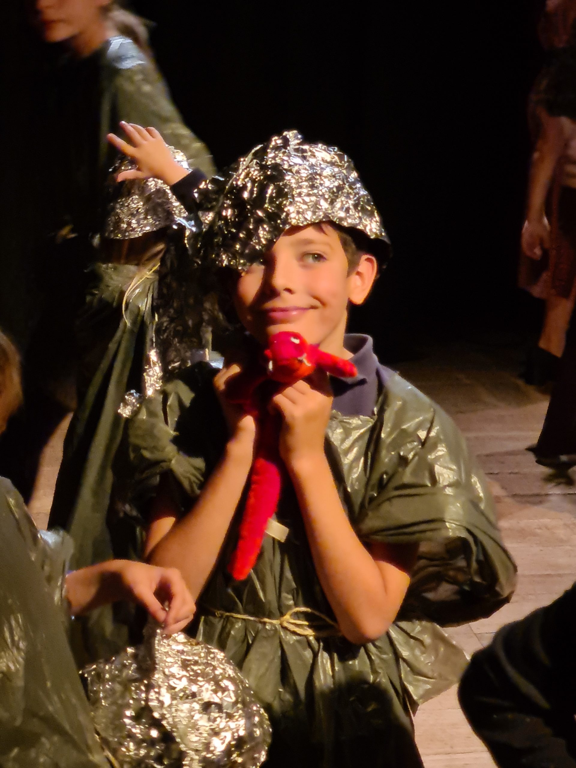 Création des décors et accessoires en arts plastiques et apprentissage du théâtre et du jeu face caméra.